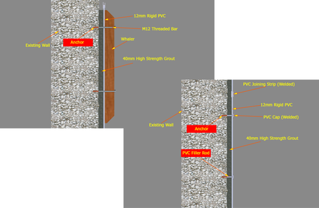 The whalers are secured to the original concrete wall with fixings through the PVC lining holding it in place. Once the grout has cured, the whalers then are removed and can be re-used over and over again. The remaining fixing holes in the PVC lining are then capped and welded ensuring a gas tight seal.